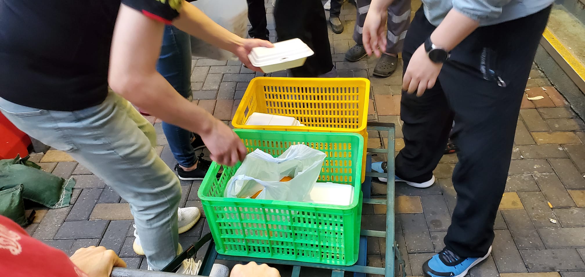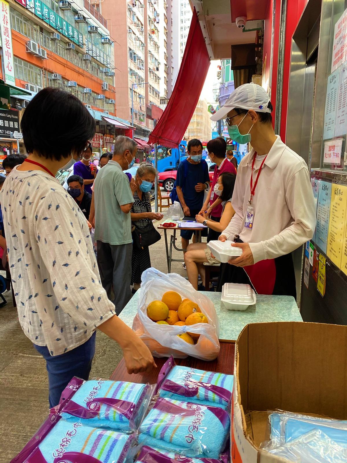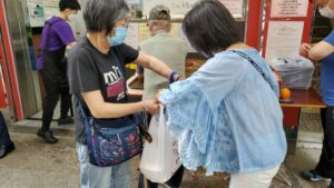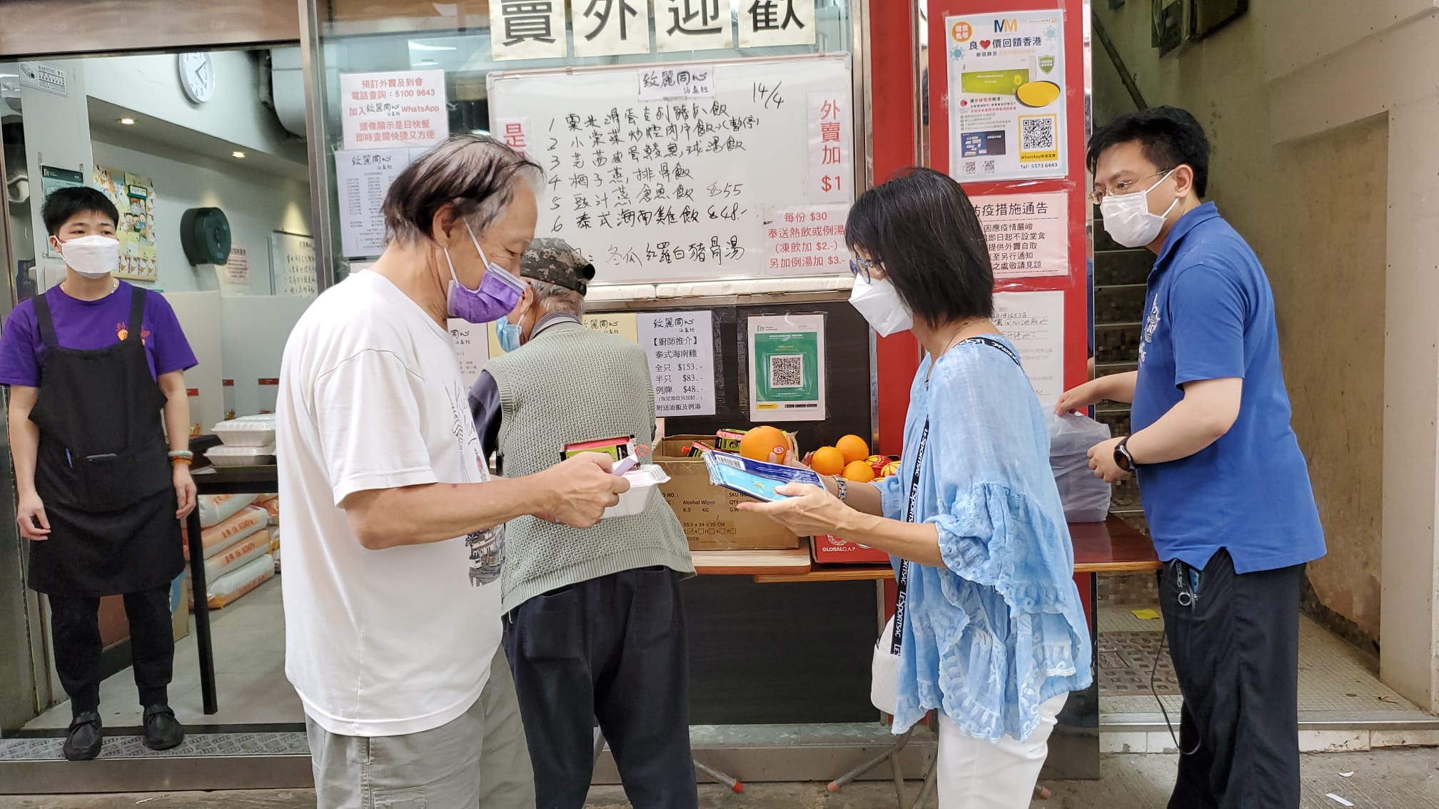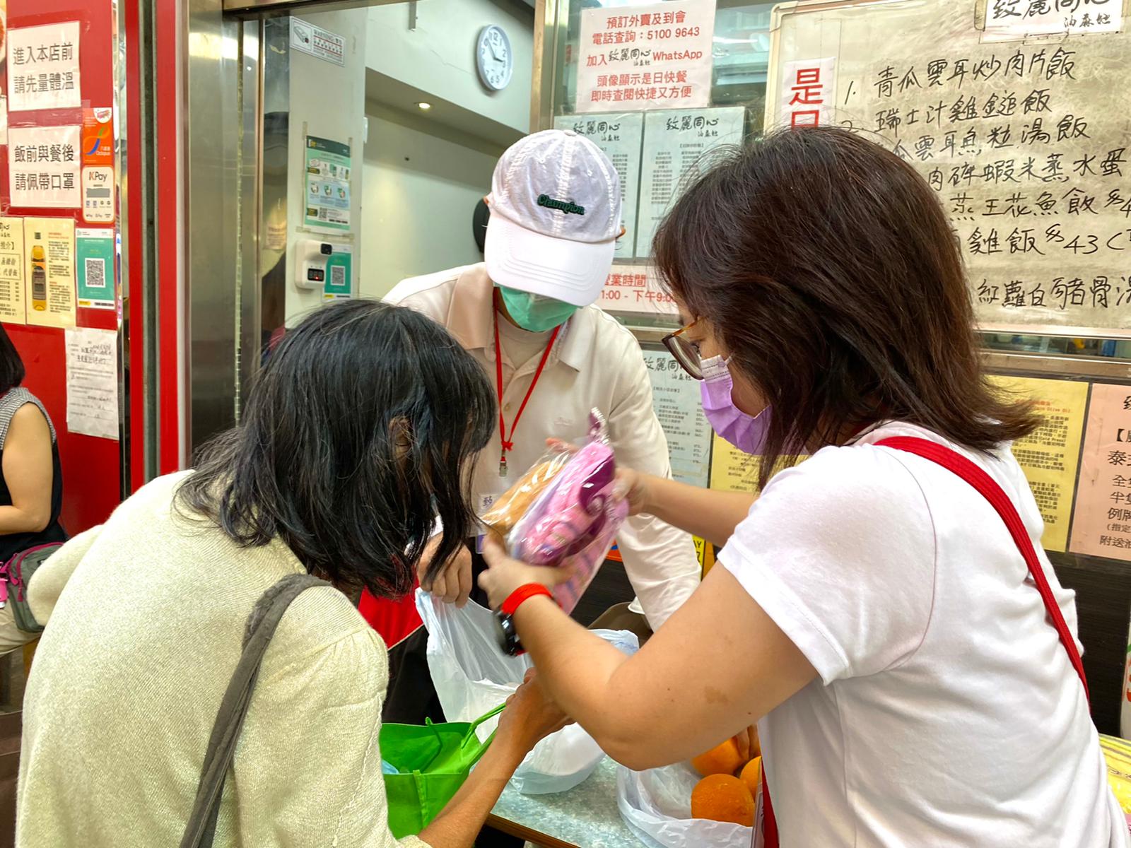派發飯餐予長者及露宿人士,包括飯盒、生果及口罩。
