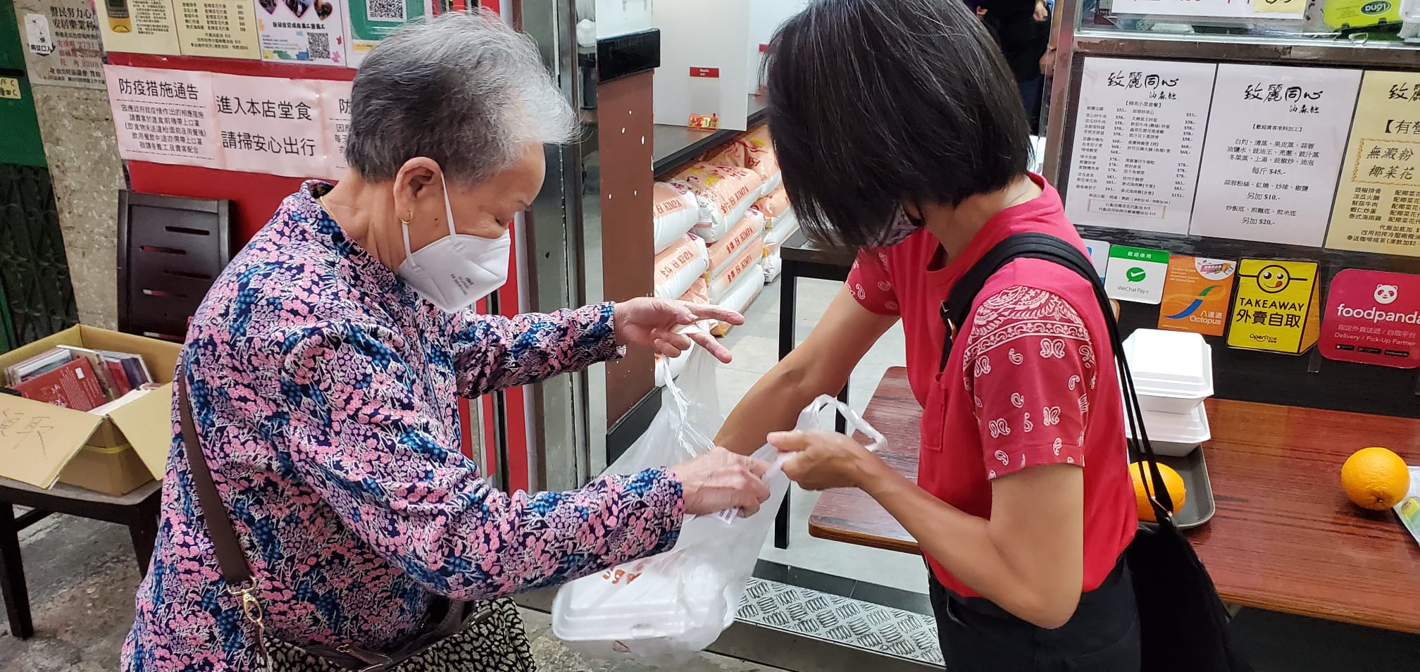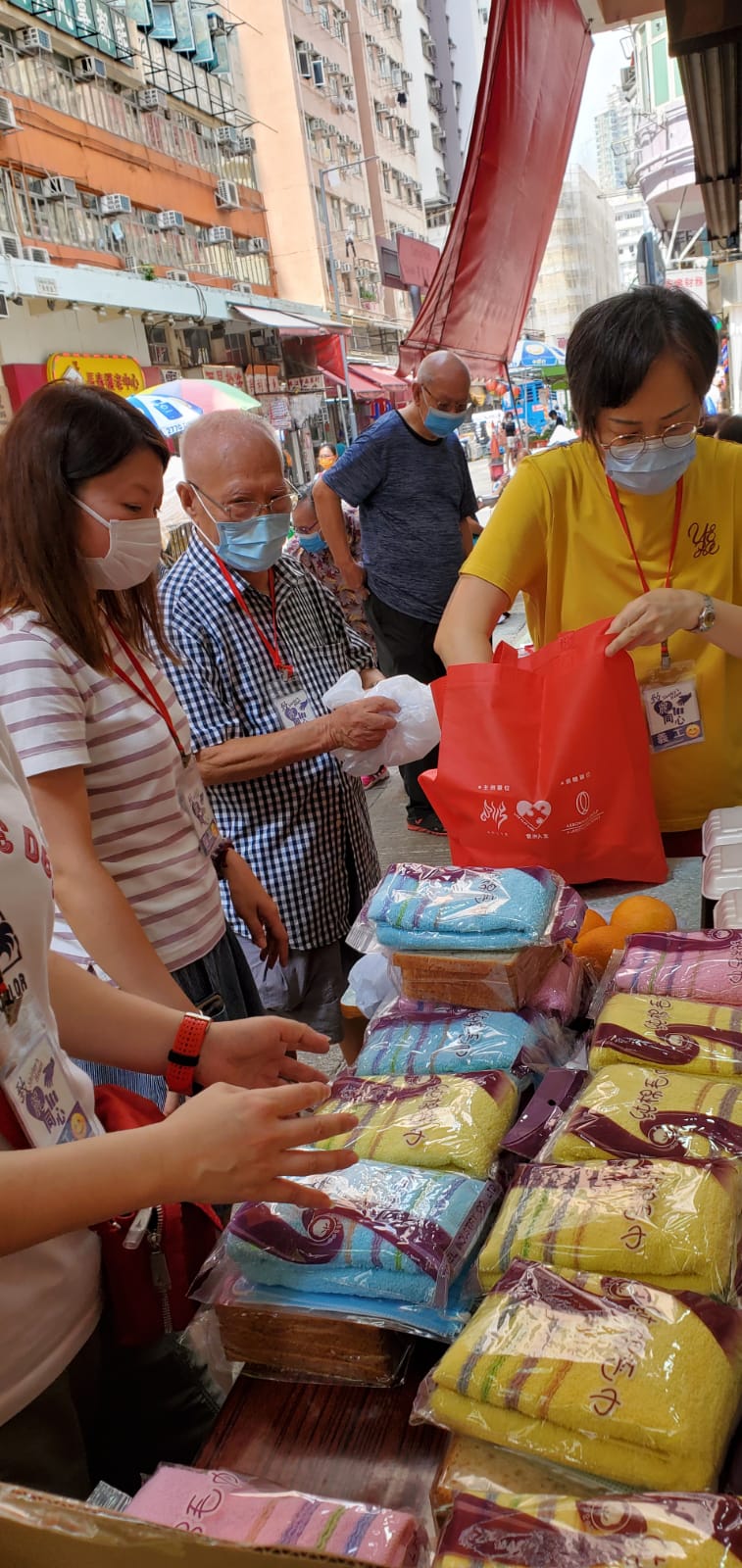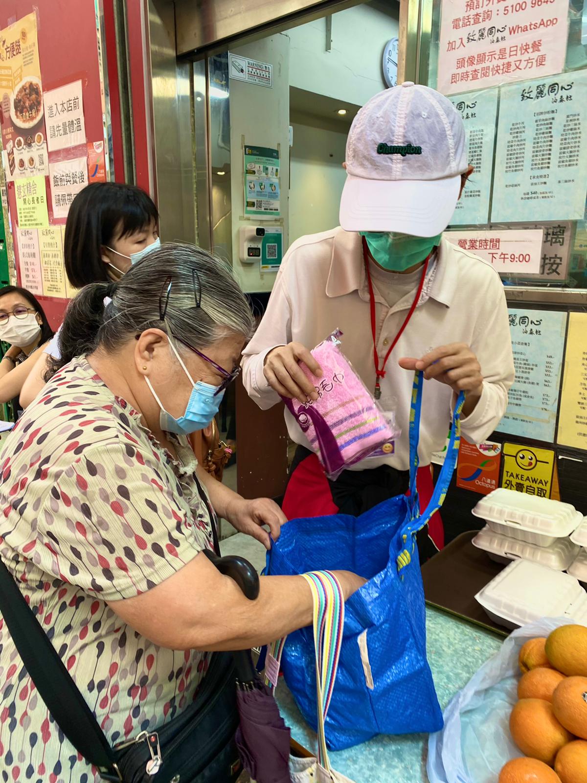 派發飯餐及物資予長者及有需要人士,包括飯盒、生果、口罩、麵包及毛巾。